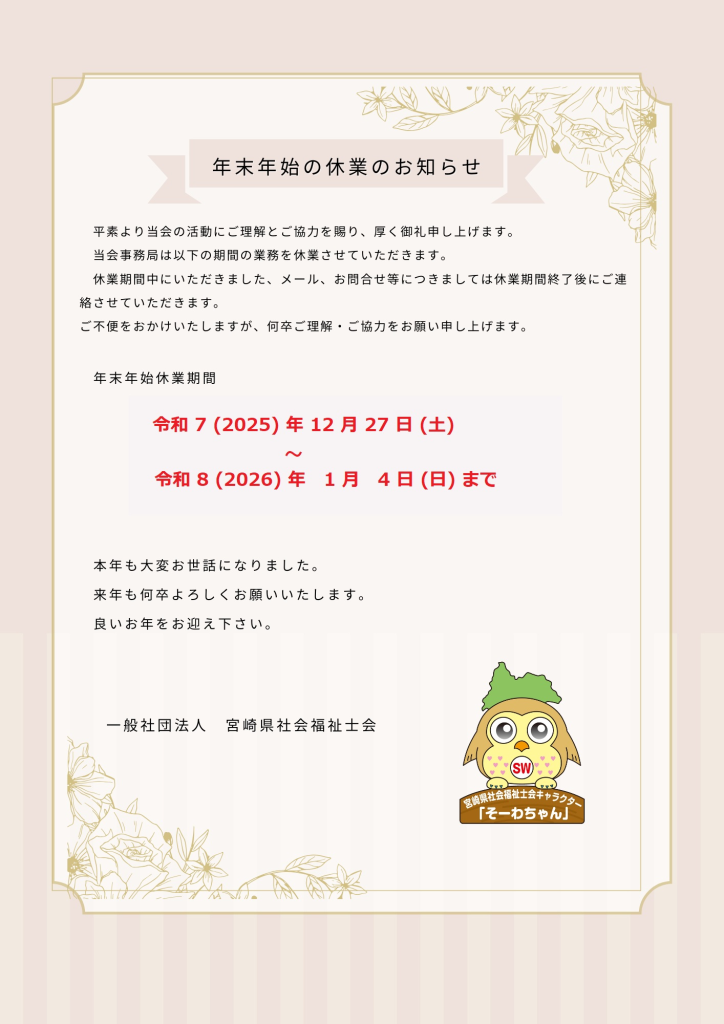 年末年始に伴い、当会事務局は下記期間にて休業させていただきます。